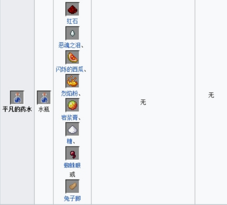 2.平凡的藥水=(烈焰粉、蜘蛛眼、岩漿膏、惡魂之淚、糖、兔子腳、閃爍的西瓜)任選一個 水瓶(製作藥水的基礎,直接喝無任何作用)