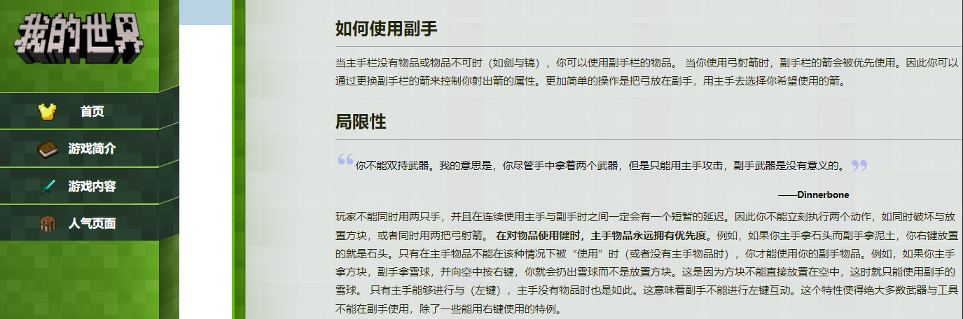 (2)下面還有一些使用小技巧:玩家現在可以使用滑鼠的左右鍵使兩隻手執行不同的動作。例如,如果玩家主手持鎬,右手拿火把,右鍵就會放置火把。這是因為鎬沒有右鍵互動,遊戲就會嘗試去用副手欄物品實現右擊動作。玩家不能同時點擊左右鍵。玩家可以把物品欄中的物品放在副手欄上並且副手持該物品。副手欄上有一個盾牌圖案以便區分。按F(默認)將切換主副手物品(包括空物品欄)。當副手欄不為空時它會在快捷欄邊上顯示,右手玩家對應左邊,左手玩家相反。只有主手可以用來攻擊或破壞。右鍵造成效果者例外,如弓與噴濺藥水。使用弓時,箭的選擇取決於玩家的物品欄與副手欄。副手欄的箭優先度最高。若無,最接近第一欄的箭優先度最高。若弓在副手,已選定的快捷欄中的弓優先。若有多種箭,但是沒有一種位於副手或主手上,第一快捷欄中的箭被優先使用。第一人稱視角下,空的副手不顯示。在基岩版中,副手可以攜帶箭,盾牌與不死圖騰。盾牌可以通過潛行使用。