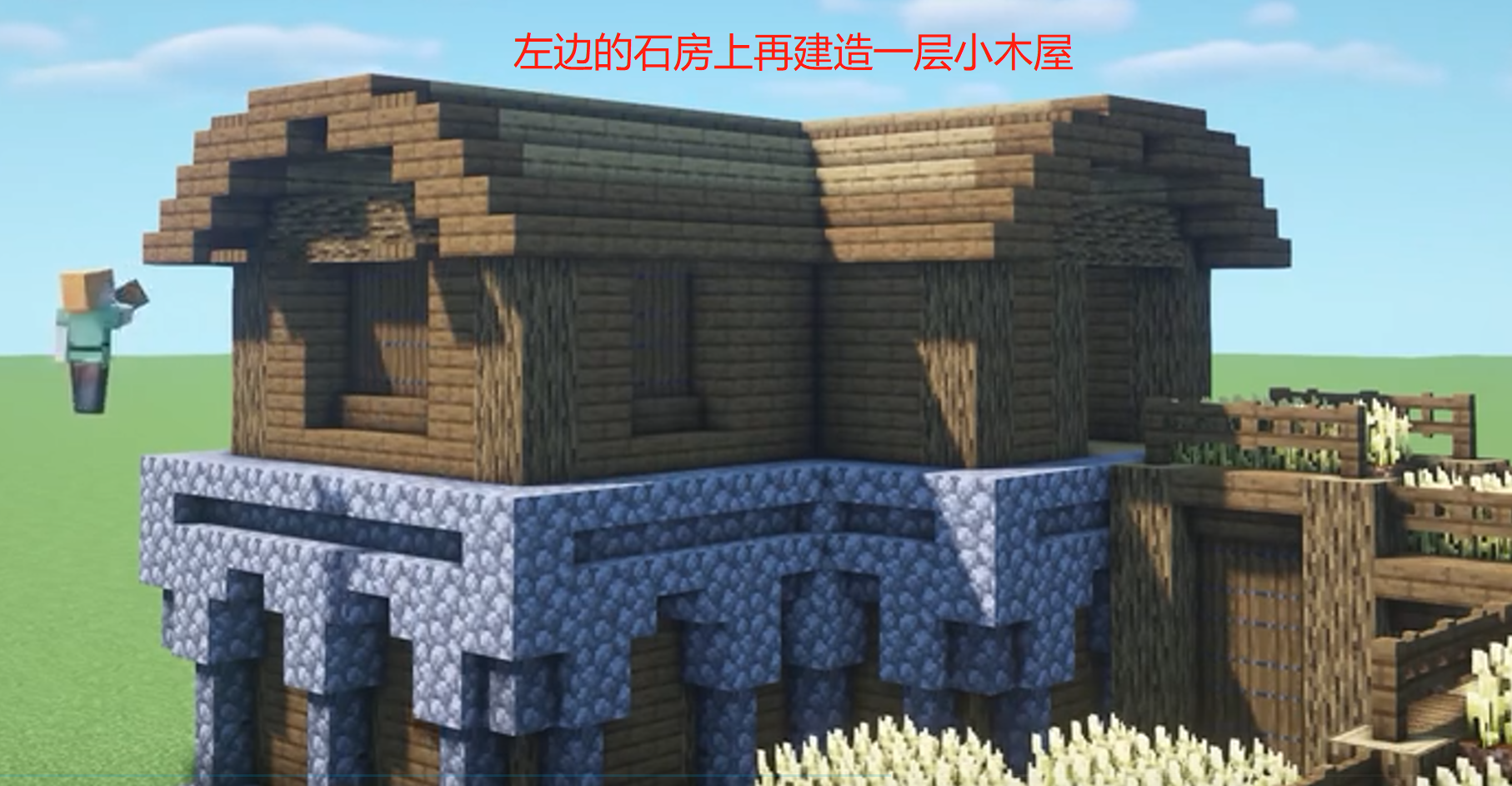 五、然後我們把左邊的石房上再建造一個小木屋,增加倉庫的可儲存面積。