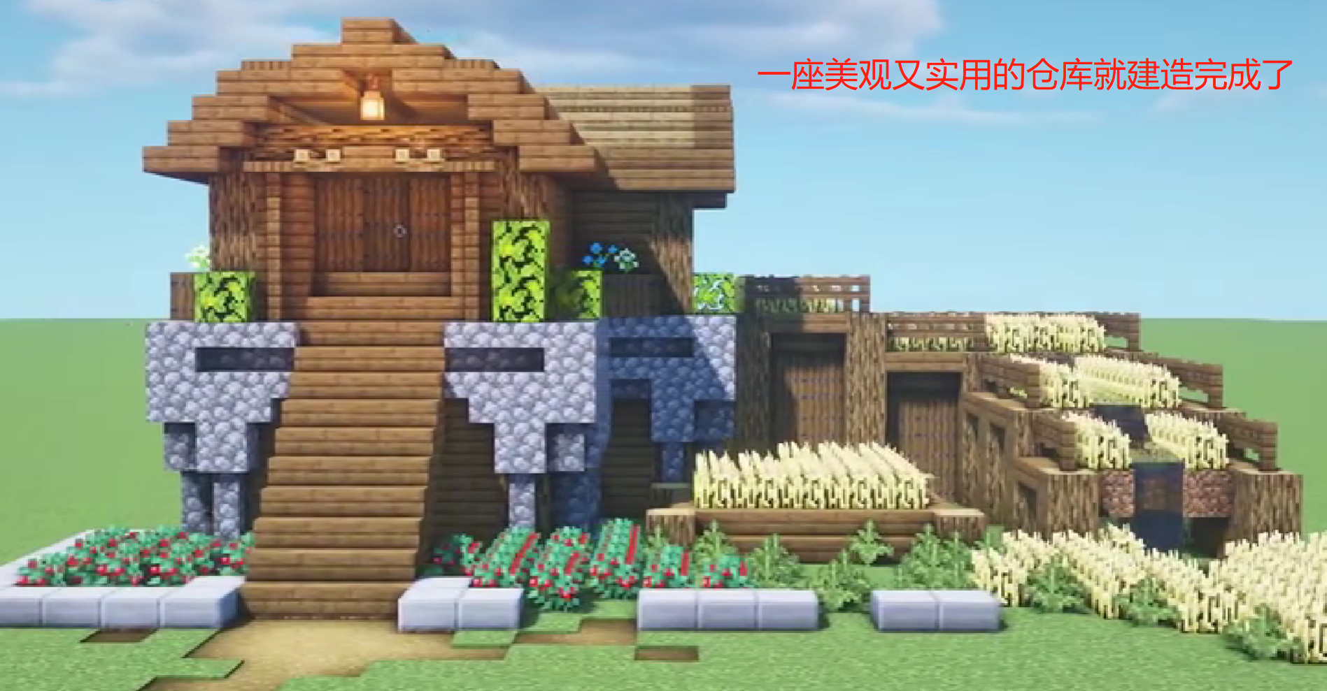 六、最後我們再建造一個樓梯和倉庫門,種一些花花草草,這樣一座美觀又實用的倉庫就建造完成了。