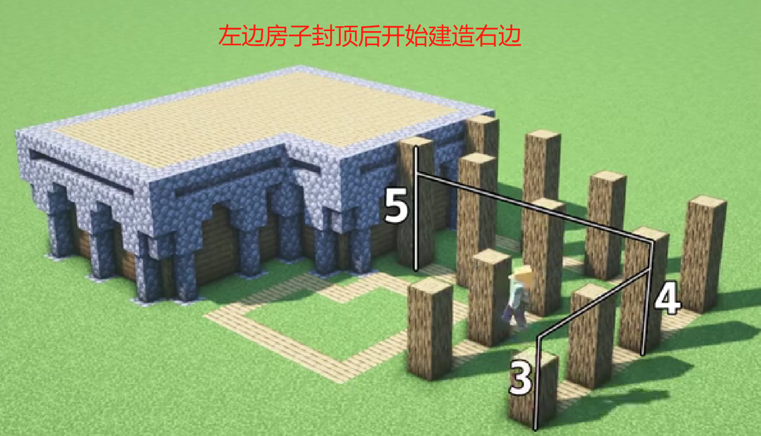 三、左邊的部分封頂之後,開始建造後邊的柱子,高度為3,寬度為4,長度為5.