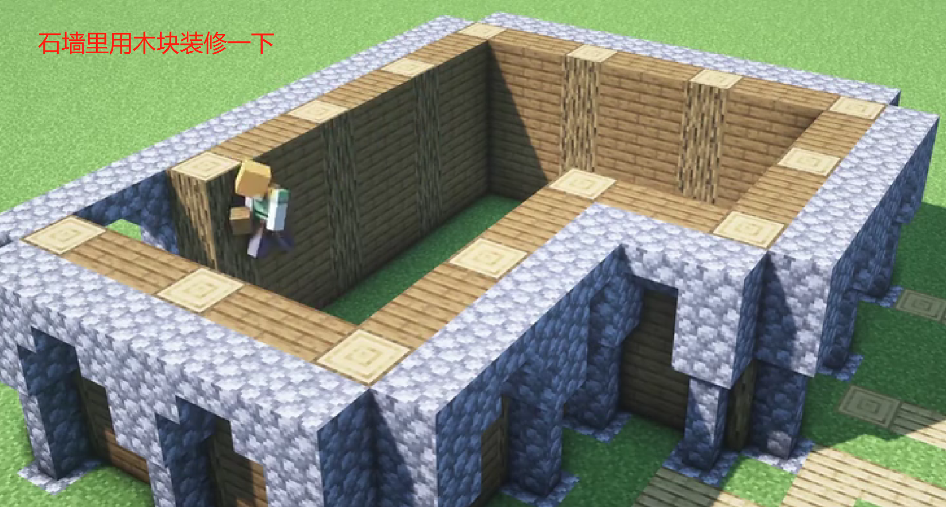 二、然後在地基上面建造一片石牆,石牆里用木塊裝修一下。