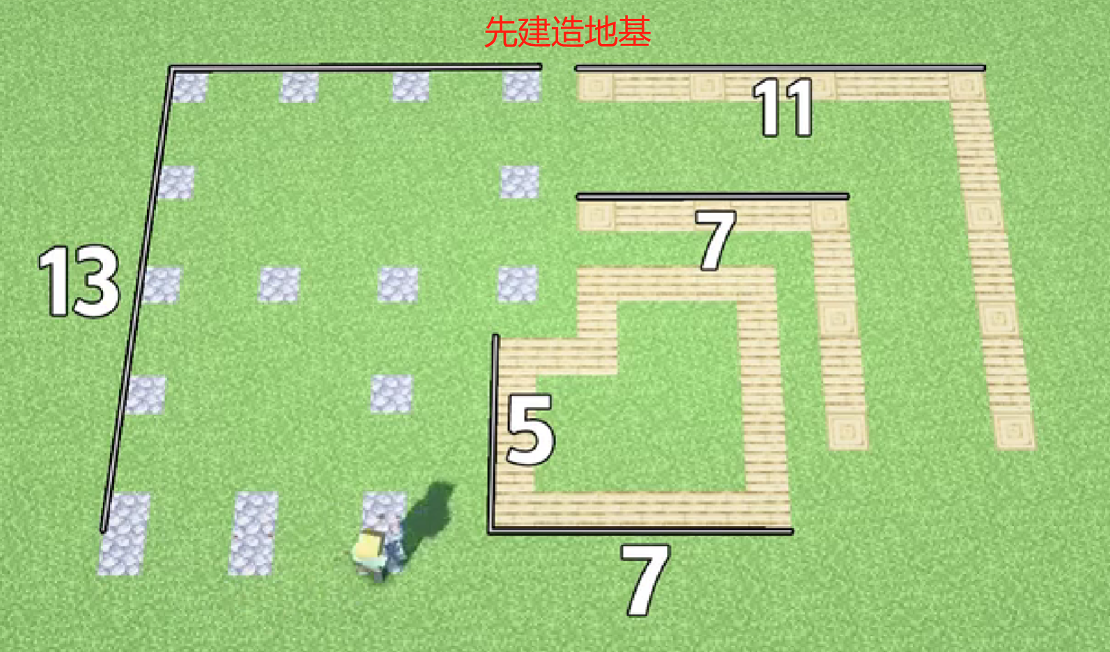 一、我們先打好地基,用石頭和木塊鋪地基,如圖所示。