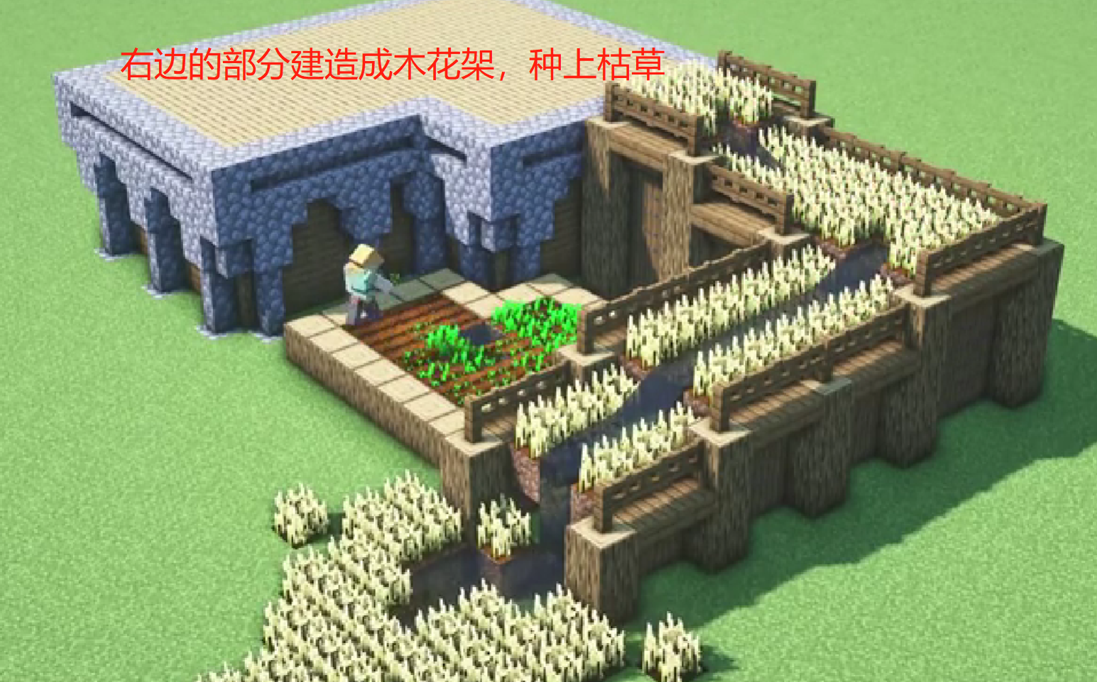 四、右邊的部分做成木質花架,在上面種上枯草,提升美觀度。