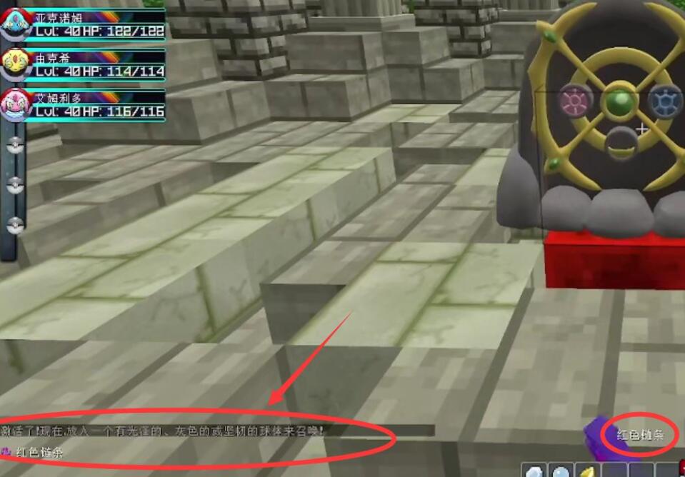 首頁 我的世界 問答 mc時空祭壇怎麼用? 2022-08-28 時空祭壇可以召喚各種神獸,詳細步驟如下;1,首先來到時空祭壇。2,點擊紅色鏈條。3,放入紅色鏈條。4,進行召喚。5,最後就會出現神獸帕路奇犽。