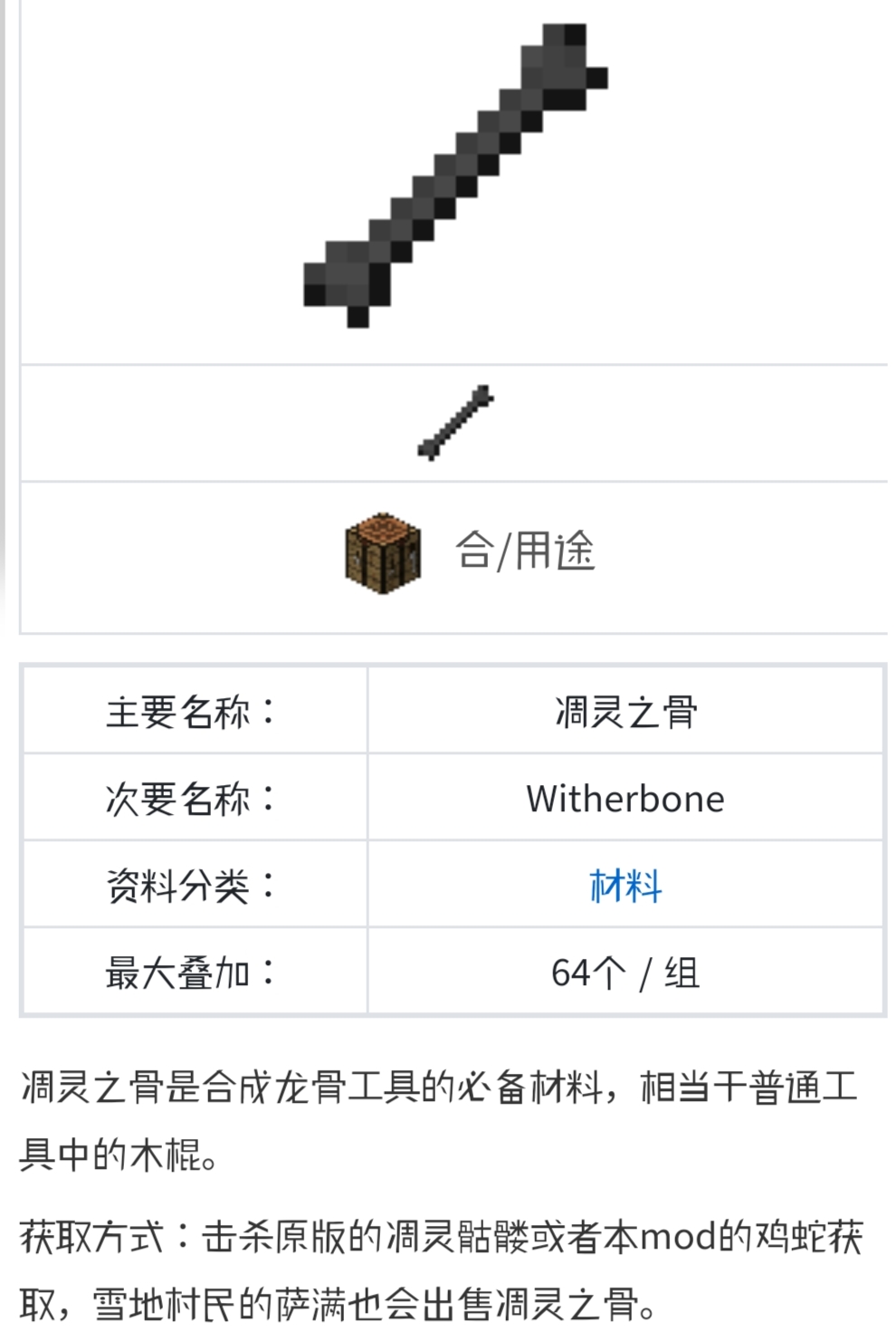 在我的世界這款遊戲中,擊殺原版的凋靈骷髏或者本mod的雞蛇可以獲取凋靈之骨,雪地村民的薩滿也會出售凋靈之骨。