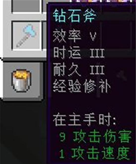3、鑽石斧:效率5,時運3,耐久3,經驗修補。斧子的主要作用是砍伐木材。在生存遊戲中,附加效率可以提高砍伐木材的速度,附加耐久可以保證斧子的使用時間加長。