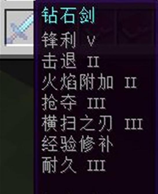 1、鑽石劍:鋒利5,耐久3,橫掃之刃3,擊退2,火焰附加2,經驗修補,搶奪3小鋒利比截肢殺手,亡靈殺手更加的有性價比。