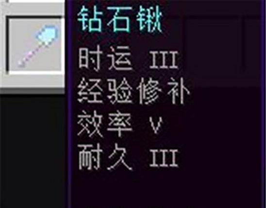 4、鑽石鍬:時運3,經驗修補,效率5,耐久3。鑽石鍬耐久高,等級高,速度快,幾乎所有礦物都能挖,帶一把在手能省去非常多的事。