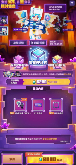 魔龍使要8000個鑽石才能購買,並且魔龍史這個皮膚它有兩種形態,一是穿著白甲的光形態,二是紫黑色加持的暗影形態。