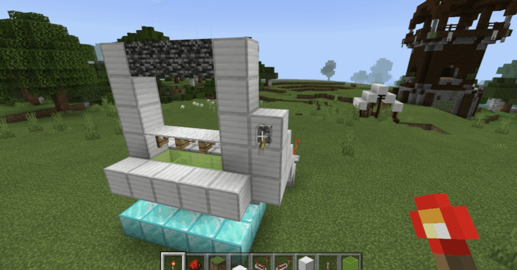 4、記住要在粘性活塞的後方,擺一個插有紅石火把的任意方塊
