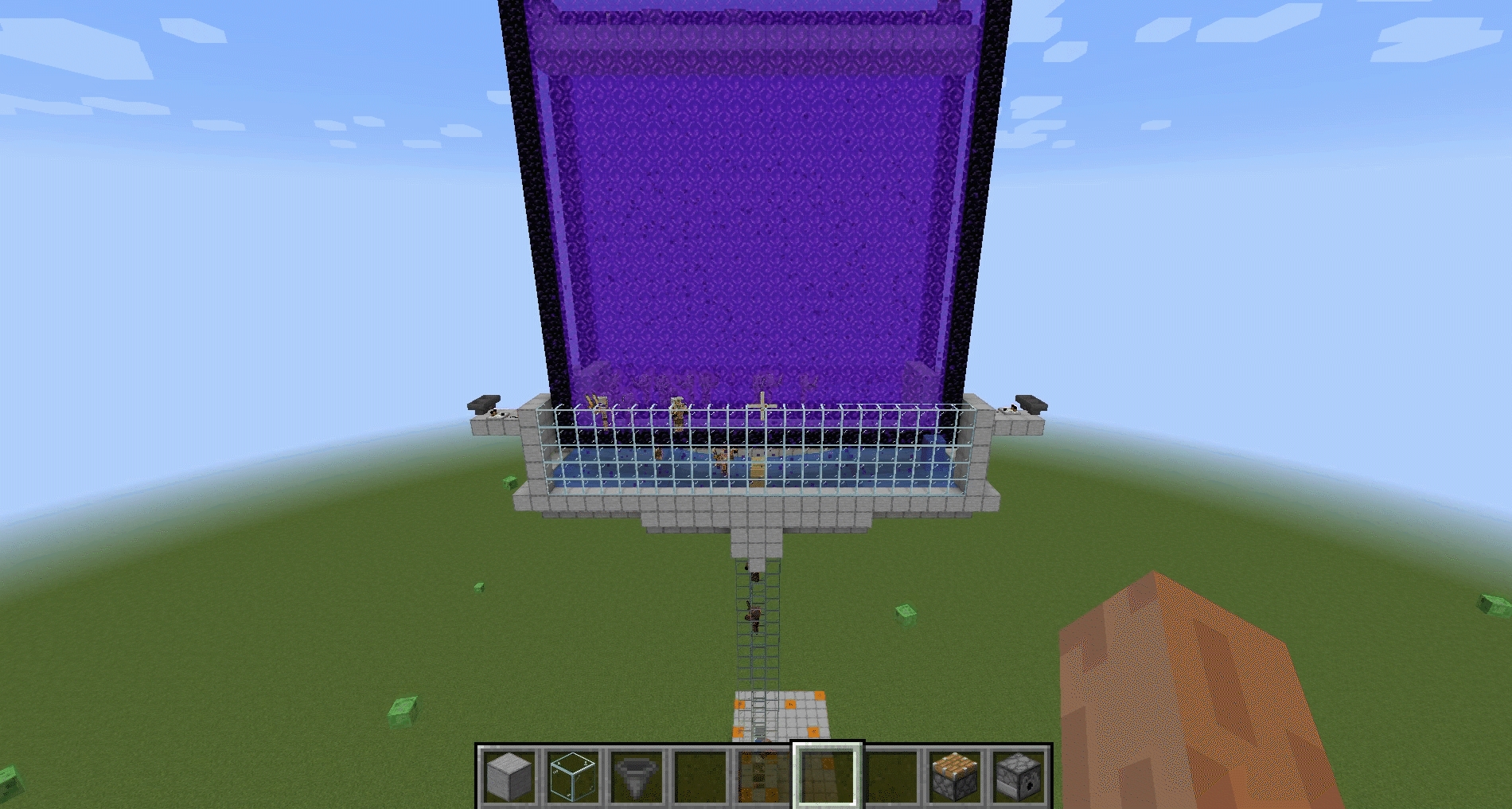 23、這樣一個簡單高效率的豬人塔就完成了,頂層的打火石會激活地獄門,然後延遲1秒後,底層的水流會摧毀地獄門,如此反覆。每次地獄門激活都會刷新1-2隻豬人,豬人出現後會掉入水中摔死。