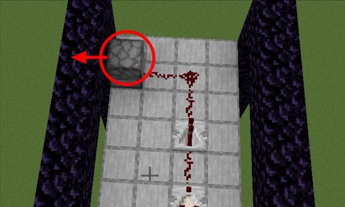 14、在其中距離地獄門最近的方塊放置一個朝向地獄門的發射器,發射器後面放置兩個紅石轉彎過來再放一個紅石中繼器-紅石-紅石比較器