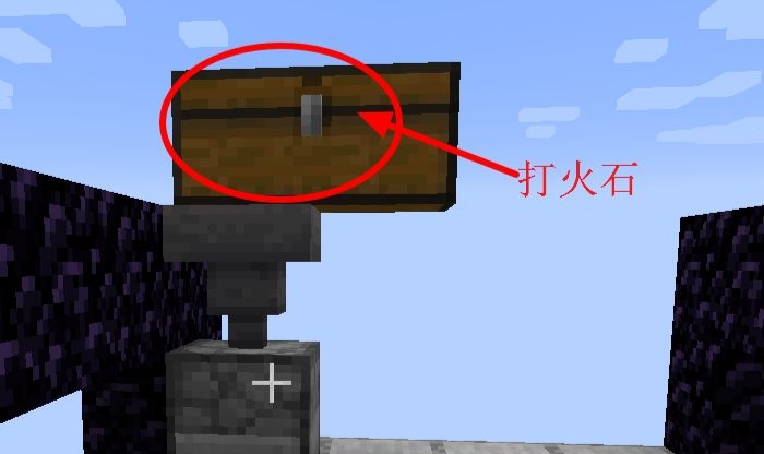 17、發射器上面放置一個漏斗,漏鬥上面放置一個箱子,箱子裡面裝滿打火石(打火石是有耐久的,這樣可以保證有打火石報廢後,新的打火石能取代舊打火石。不過打火石耐久還是挺高的,一箱子打火石基本可以實現無限使用了)