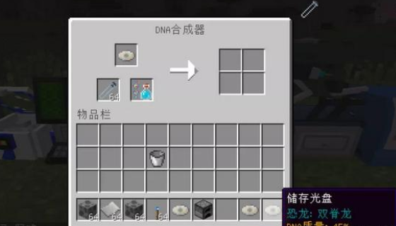6、第六步用百分百DNA的光碟放入DNA合成器,接著放入試管還有核苷酸等待一會兒就可以得到帶著恐龍DNA的試管。(核苷酸需要把水瓶放入熔爐燒一下就可以得到核苷酸)。