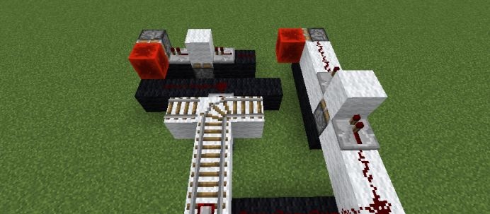 3、第三步:鋪設鐵軌,在下面連接紅石電路的地方鋪設探測鐵軌,在交叉處鋪設普通鐵軌,其他地方可以根據實際情況自行選擇鋪設充能鐵軌或者普通鐵軌。