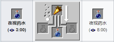 材料:金胡蘿蔔 粗製藥水。藥水效果:能夠在煉獄,或是天黑的時候應用,認清身旁的物件。使一切以最大亮度顯示,包括水下區域。