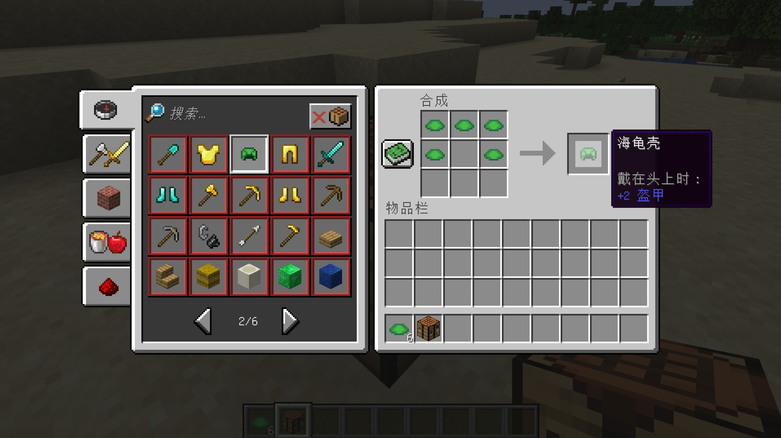 2、將麟甲安裝如圖所示的位置擺放好之後,可以看到右側合成欄中會出現玩家需要合成的物品海龜殼,該物品玩家可以戴在頭上可以延長玩家在水下呼吸的時間。