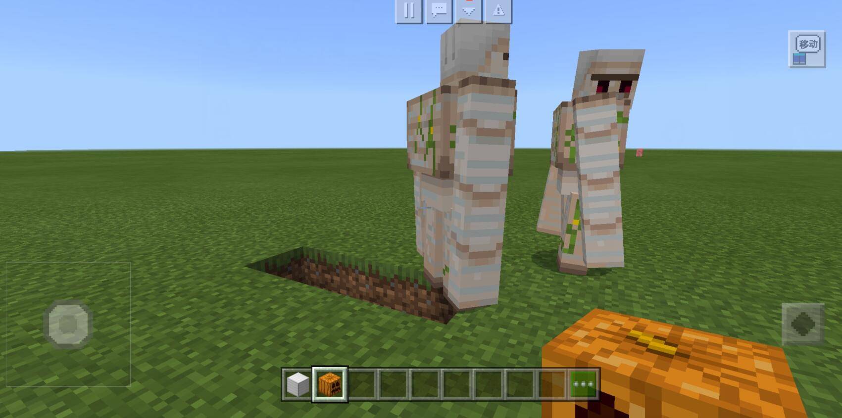 首頁 我的世界 問答 我的世界超級鐵傀儡怎麼做? 2022-08-31 一、【我的世界】遊戲中首先需要把四個鐵塊擺成T字形,如下圖所示;二、在中間鐵塊上面放一個南瓜頭,如下圖所示;三、即完成鐵傀儡的製作,如下圖所示。
