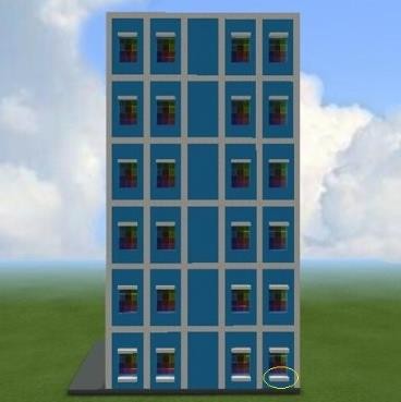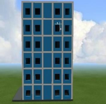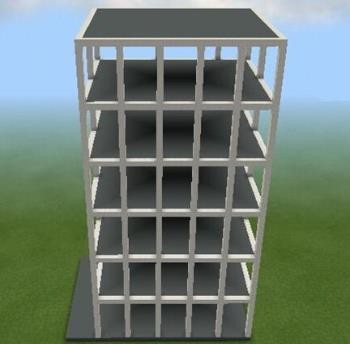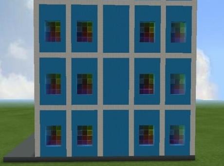 5、前面開鑿掏空,每扇空窗面積為3×4格,每層地板向上空2格開始鑿空窗。安裝多種顏色的彩色玻璃。