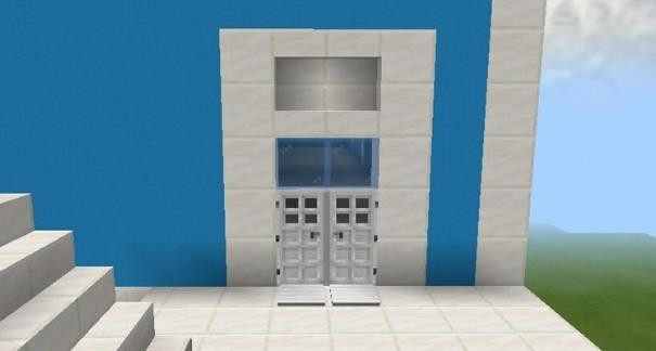 10、搭建門,淡藍色玻璃上用了4塊石英樓梯。每層樓的門搭建完成。只要在有門的地方都要在旁邊搭建護欄。