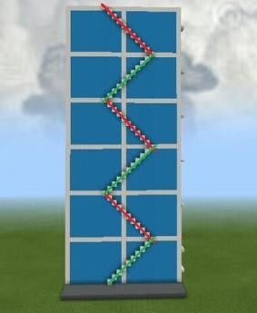 7、如何搭建樓梯!做了個示範:紅線為左傾斜樓梯,綠線為右傾斜樓梯。左右傾斜樓梯並不是在一條線上,左傾斜樓梯向外1格。