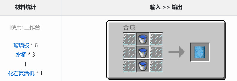 化石復活機是用6個玻璃板和三個水桶在工作台處進行合成的,我們把6個玻璃板分別擺在兩側,然後把三個水桶放在中間就能合成一個化石復活機。化石復活機和化石復活機機蓋,化石復活機顯示器,化石復活機基座合成化石機。化石機能夠將各種化石孵化出來。