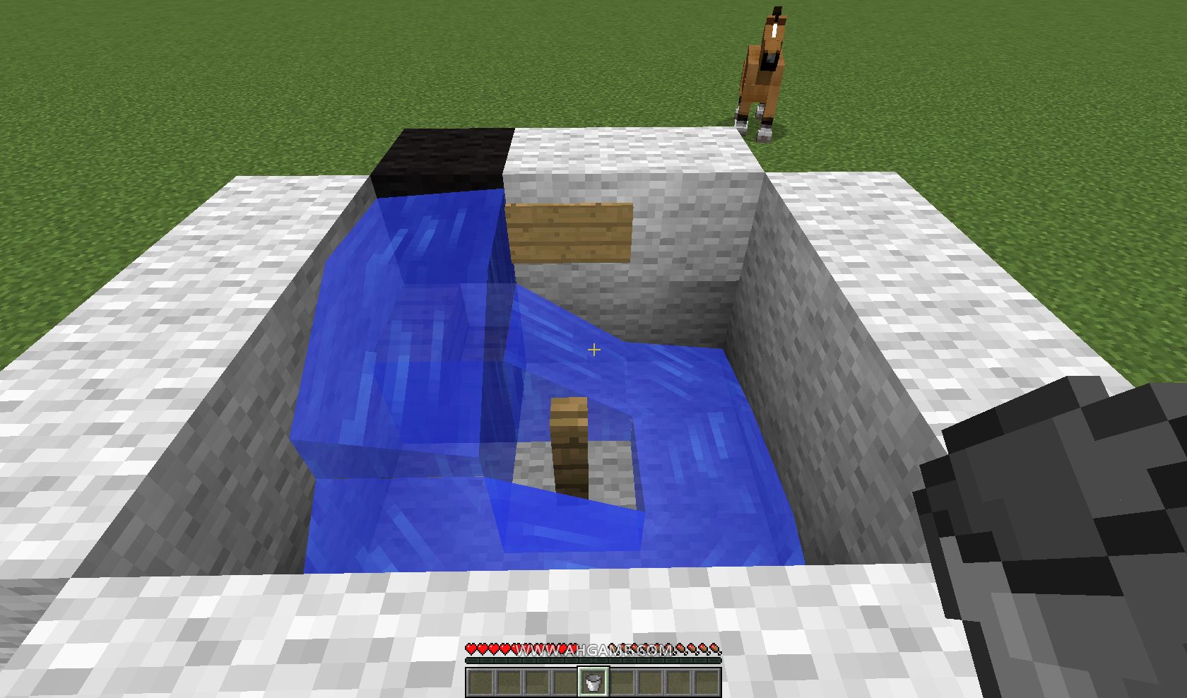 4、注意:一定要在黑色羊毛處放水!之後玩家跳進去就行了。