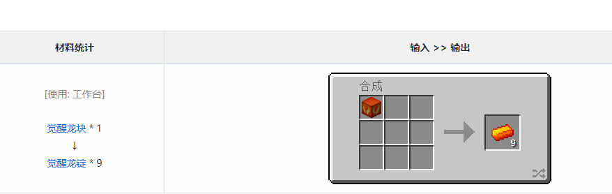 覺醒龍錠是由覺醒龍塊分解得到,覺醒龍錠可以做覺醒級別的龍之護甲與工具,也是反應堆的燃料,但是一個是不可以開啟反應的。