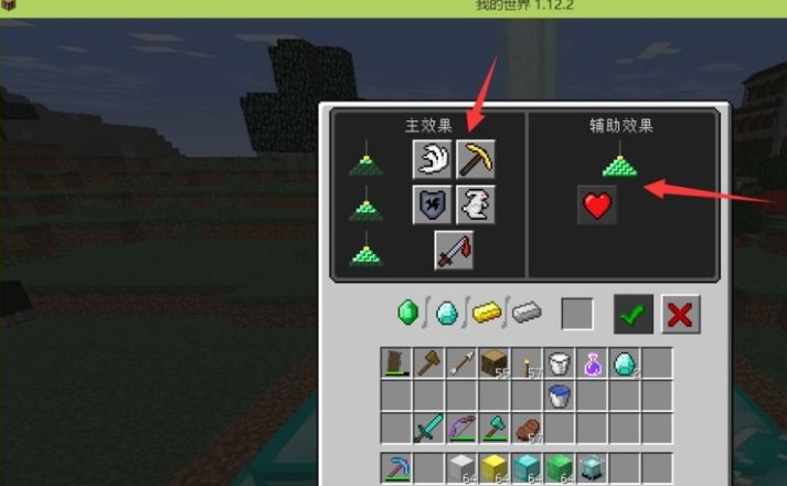 3、激活這些buff的方式是(最好用方法三的基座,這樣buff才能更好加成出來),用一個鐵錠、金錠或者鑽石、或者綠寶石中的一個,放到格子中,點擊左邊的主效果中的一個,點擊下面的綠色勾就可以了。