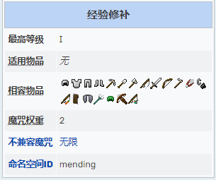 首頁 我的世界 問答 我的世界經驗修補英文是什麼? 2022-09-04 Mending。經驗修補屬於寶藏型魔咒,無法通過附魔台獲得。通過箱子戰利品、釣魚、交易或襲擊可以獲得帶有該魔咒的附魔書、武器、盔甲或工具。