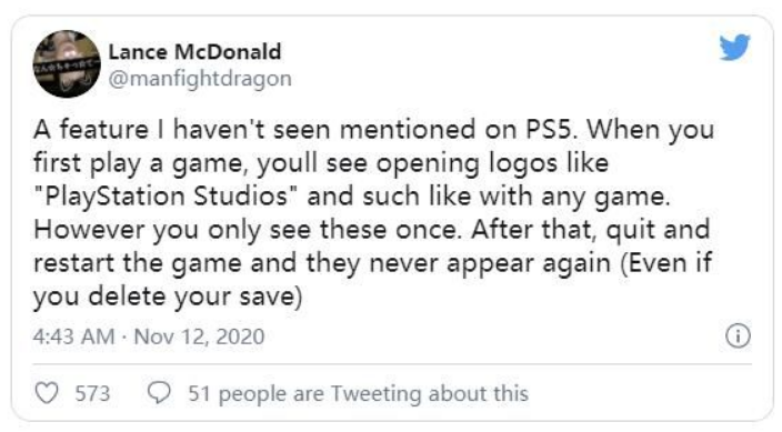 近日,魂系列遊戲著名MOD作者Lance Mcdonald(就是那名製作《血源詛咒》60幀MOD的玩家)已經入手了PlayStation 5主機,並分享了一個細節:這次PS5增添了自動跳過了遊戲開始時都會有的廠商Logo展示環節,如同遊戲內cg跳過一樣,只需要看第一次,後面再進入遊戲就不會出現了(甚至你刪了存檔,一樣看不見這個環節)。