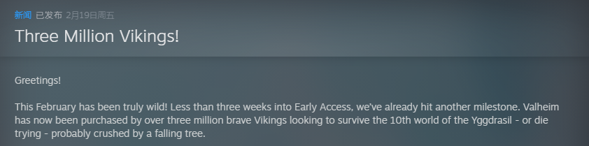 在2月19日,官方發布了公告。公告稱,在《Valheim: 英靈神殿》發售不到三周時間內,已經有300萬玩家加入到遊戲中了。