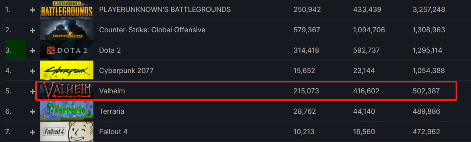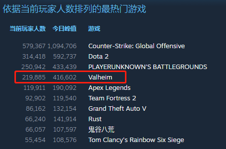 根據SteamDB的數據統計顯示,Steam平台史上「同時在線玩家數」最多的遊戲為《絕地求生》、而《Valheim: 英靈神殿》則是排在了第5的位置,超過《泰拉瑞亞》和《輻射4》。
