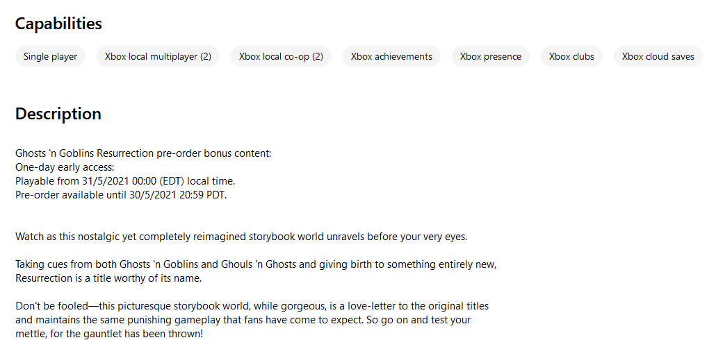 根據微軟商城的新消息,《經典回歸魔界村》預計將於2021年6月1日登陸PS4、Xbox One與PC(Steam)平台,此外,預購數字版的玩家可提前一天遊玩。