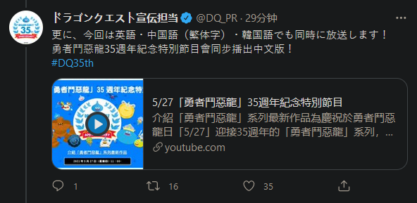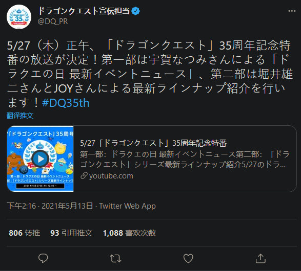 遊戲官方宣傳推特今天發表推文稱,將會播出《勇者斗惡龍》35周年特別節目。