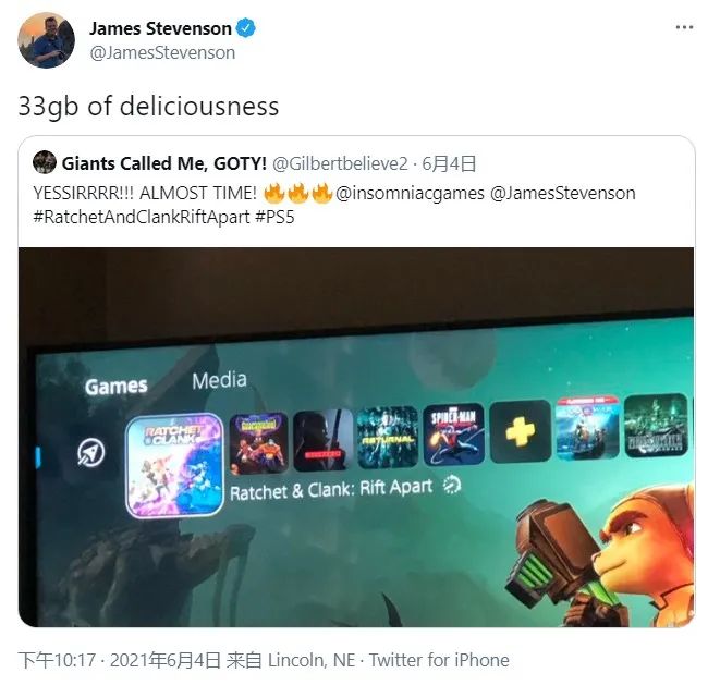 開發商Insomniac工作室的社區經理James Stevenson在推特上曬出了《瑞奇與叮噹:分離》的最新容量為33GB,之後他又在回復中表示PS5遊戲容量變小得益於PS5遊戲壓縮技術和最新的SSD。