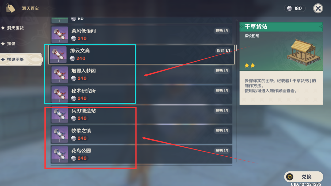 一、進入塵歌壺,找阿圓交談,點擊洞天百寶—擺設圖紙—用洞天寶錢購買套裝圖紙,(紅色是室內套裝擺設,藍色是室外套裝擺設),
