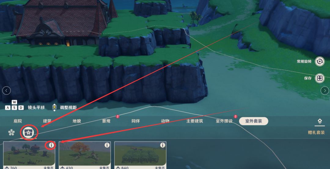 三、PC端按F7打開擺放桌面,點擊室外套裝,第二個便是,點擊感嘆號。