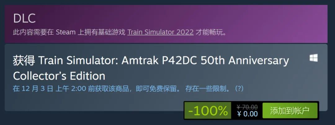 領取鏈接:https://store.steampowered.com/app/1717654/Train_Simulator_Amtrak_P42DC_50th_Anniversary_Collectors_Edition/