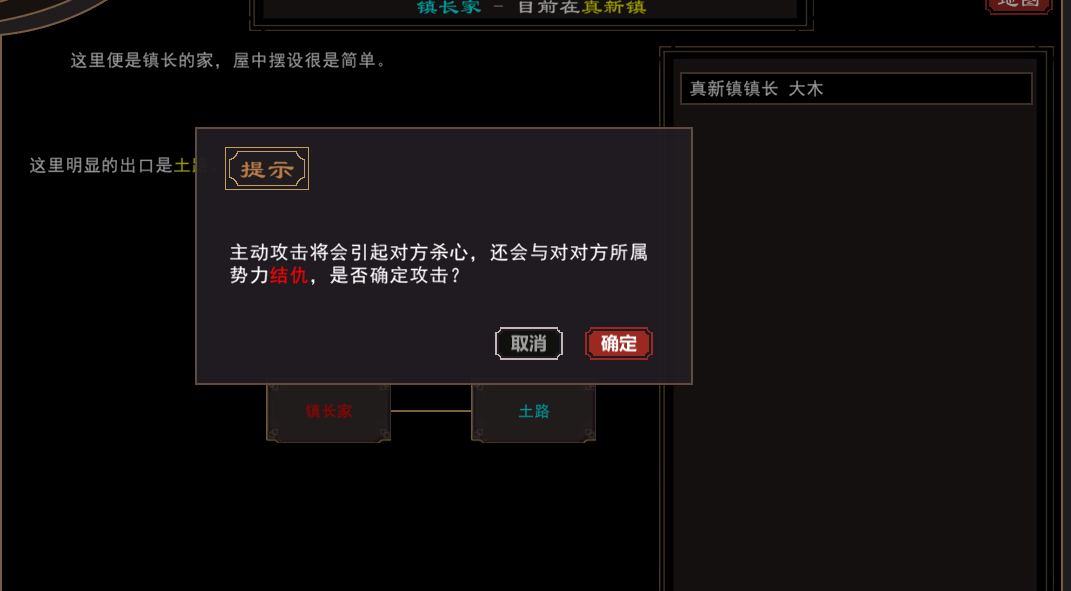 仔細想想,這完全沒有道理。很多新手村就是個普通的村子,和外界的接觸也不多,《我來自江湖》在這點上就做得不錯:我反覆思慮,最後存好檔,出手攻擊新手村「真新鎮」的鎮長後,發現他和文字描述一樣,就是一個普通的老人,戰鬥力非常低下。我惡向膽邊生,沖進鎮子殺光了每個人,血都沒怎麼掉。而朝廷也沒有派人來抓我,只是提示正邪值減少。