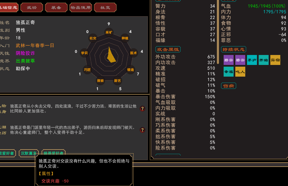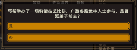 這種沉迷不僅是由於模擬經營的「我還有件事要干」,在遊戲世界裡漫遊、探索的RPG要素也佔了很大的比重。《我來自江湖》中有不少隨機事件,既有比較傳統的門派恩怨、殺人奪寶、護送押鏢,也有一些技藝比賽或者受邀做客之類的小遊戲。很多事件和任務的自由度也比較高,有好幾種完成的方法,有些任務和事件本身沒有獎勵,而是影響之後的故事發展。