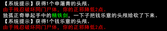 作為一個正常玩家,當然是習慣能點的按鈕都點一遍。於是這幾位劫後餘生的門派弟子,在我的控制下,莫名其妙就把死去同門的頭給砍掉了,還把頭顱收到了背包里,當即就掉了不少正邪值。