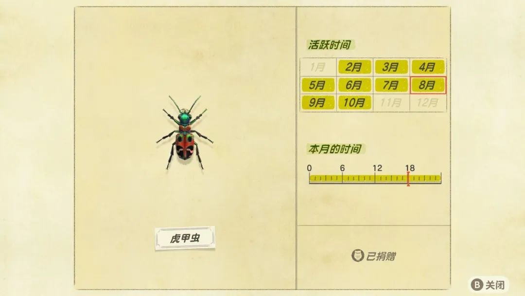 18、虎甲蟲 | 賣價:1500 | 棲息地:草地 | 時間:全天(除雨雪天氣)