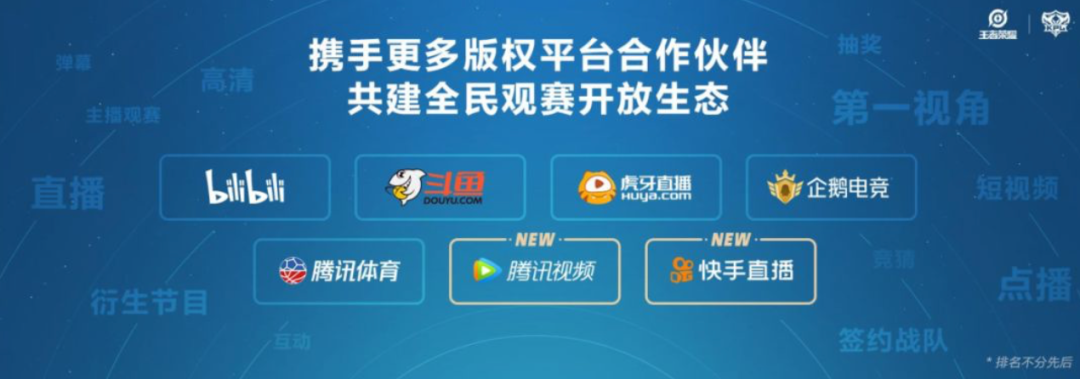 2020 LPL全程版權合作夥伴包含企鵝電競、虎牙直播、斗魚直播、Bilibili直播、快手遊戲直播、騰訊體育六家。KPL今年的版權平台也有七家,新增了騰訊視頻和快手直播。