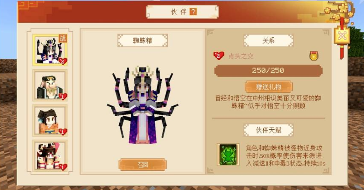 2.冒險路上當然少不了夥伴的助力,解鎖劇情即可召喚蜘蛛精、豬八戒等冒險家們熟悉的西遊角色夥伴助力你擊敗妖魔,所召喚的夥伴出戰時,能夠提供相應的特殊效果,而且向夥伴贈送禮物不僅可以提升好感度,還有幾率獲得神秘回禮。
