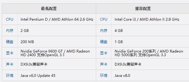 我的世界作為一款像素類的遊戲其配置要求是非常低的,具體配置如圖。只要是一般的家用電腦基本上是都可以流暢運行我的世界。