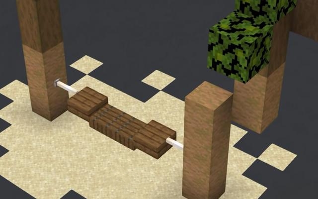 3、沙灘吊床。在沙灘吊一張床,也是很多小夥伴們的選擇。在mc中正好可以還原這個設計,而且很簡單,我們只需要建造兩個柱子裝飾,中間連接利用浮空性放置木板就可以了。