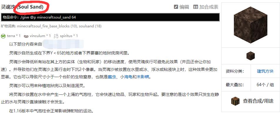 首先我們搜索並進入我的世界靈魂沙的相關說明,然後就可以在界面左上角發現,我的世界靈魂沙英文是Soul Sand。