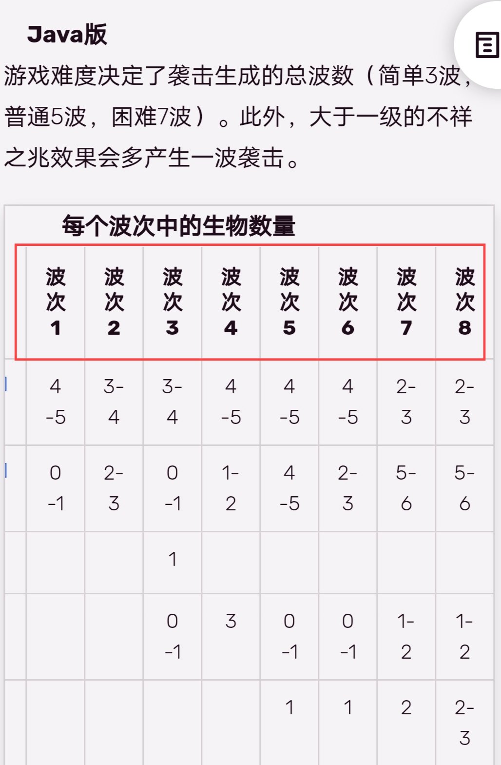 1到8波次。遊戲難度決定了襲擊生成的總波數(簡單3波,普通5波,困難7波)。此外,大於一級的不祥之兆效果會多產生一波襲擊。